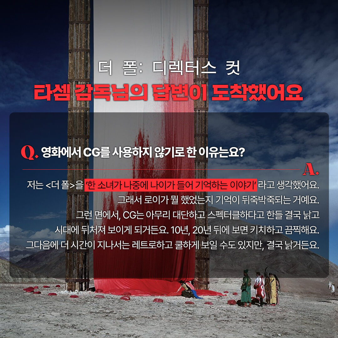 타셈 감독 지브이에서 한국 여성 관객들만큼 자기 영화 좋아해주는 사람 처음 본다고 어떻게 이렇게 훌륭한 딸을 낳았는지 그 어머니랑 다시 결혼하고 싶대 한국 아이 갖고 싶을 정도래 미치겠네