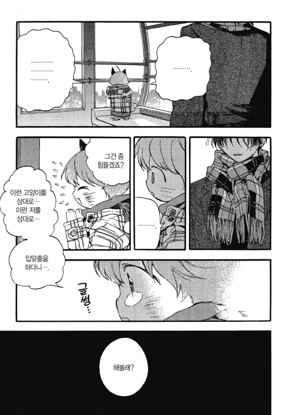 읽으면서 '그냥 힐링물로 하거나, 좀 더 사람 모습에 가깝게 데포르메시켰으면 더 대중적으로 성공했을텐데...'하는 생각을 안 한 건 아닌데, 작가 후기에서 "사람이 언제 죽을지 모르니 해 보고 싶은 걸 하고 싶었다"라는 작가의 말을 보고 납득했다.